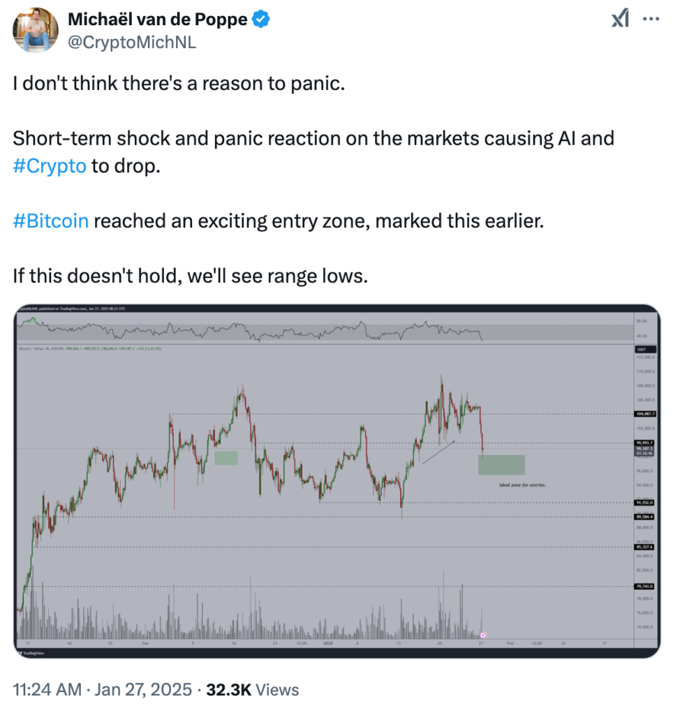از سوی دیگر، Michael van de Poppe، مدیرعامل MN Capital، با 767,000 دنبالکننده در X، به معاملهگران توصیه کرده که وحشت نکنند. وی تاکید کرد که این کاهش قیمت تنها یک شوک کوتاهمدت است و منطقه بین 98,000 تا 99,000 دلار یک فرصت ورود مناسب محسوب میشود.