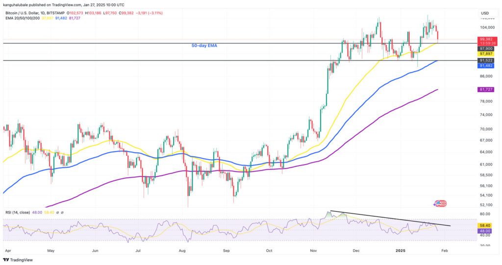 از نظر تحلیل تکنیکال، قیمت بیت کوین بالاتر از سطح حمایتی 97,900 دلار معامله میشود که با میانگین متحرک نمایی 50 روزه (EMA) همخوانی دارد. از دست دادن این سطح حمایتی میتواند منجر به کاهش بیشتر قیمت تا 91,482 دلار (تا میانگین متحرک نمایی 100 روزه) شود.